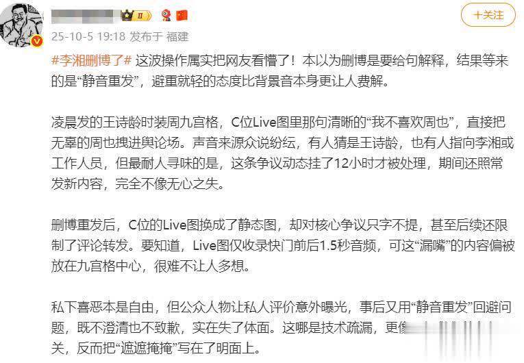 更戏剧的是时间线,从发布到删博间隔超过了将近12个小时,即便评论区早有网友提醒音频问题,可李湘团队仍未处理。