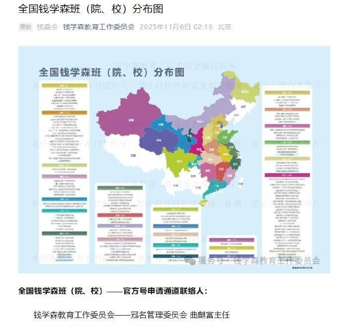 记者通过钱学森教育工作委员会公众号了解到,钱学森教育工作委员会(以下简称“钱委会”)由钱学森之子、上海交通大学钱学森图书馆馆长、北京灵境智慧公益基金会发起人钱永刚教授担任主任委员。钱学森教育工作委员会主要负责全国范围内“钱学森班(院、校)”名称冠名与肖像使用的申请审核与认定工作,确保相关使用管理规范有序、稳妥推进,并承担日常监督与统筹安排职责。