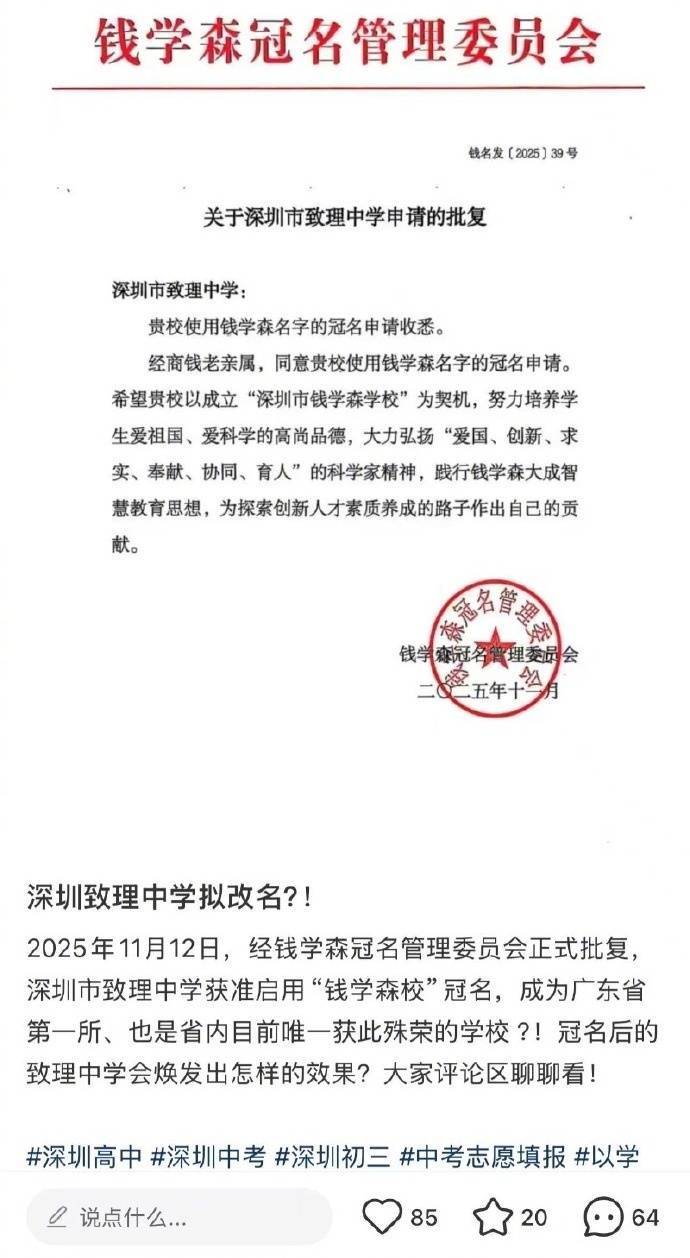 据大皖新闻,11月12日,有博主在社交平台上传了一张关于深圳市致理中学申请钱学森名字冠名的批复文件,文件中提到,“经商钱老亲属,同意贵校使用钱学森名字的冠名申请。希望贵校以成立‘深圳市钱学森学校’为契机……为探索创新人才素质养成的路子作出自己的贡献。”该文件也引发不少网民讨论,深圳致理中学是否将要改名?冠名申请有哪些要求等。